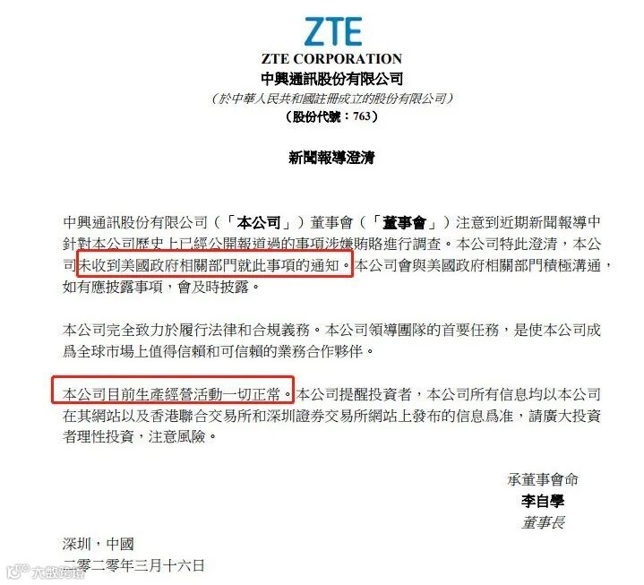 3月16日12时54分,中兴通讯在港交所发布澄清公告称,董事会注意到近期新闻报导中针对公司历史上已经公开报道过的事项涉嫌贿赂进行调查。