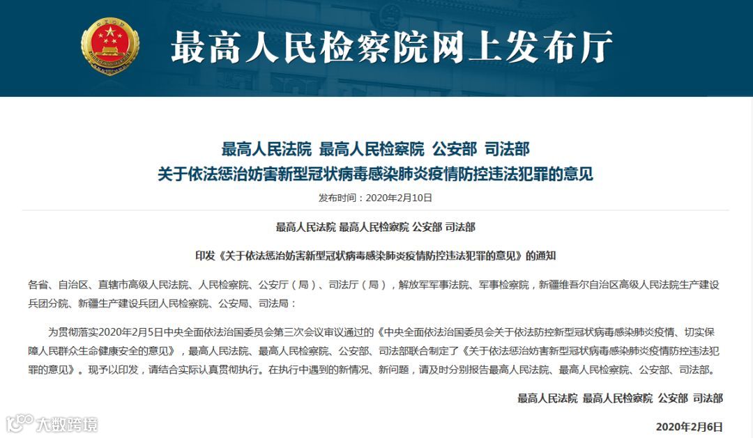 2月10日,最高检官网信息显示,最高法、最高检、公安部、司法部联合下发《关于依法惩治妨害新型冠状病毒感染肺炎疫情防控违法犯罪的意见》,对疫情中遇到的新情况、新问题给出指导意见。
