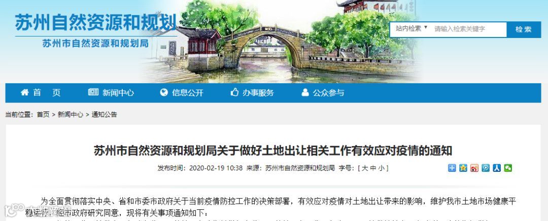 苏州市自然资源和规划局19日发布《关于做好土地出让相关工作有效应对疫情的通知》,应对疫情对土地出让带来的影响,维护土地市场健康平稳运行。