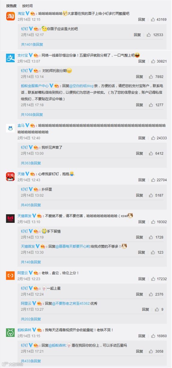 除了阿里云,阿里巴巴旗下各家APP官微同样齐心协力上阵,为自家兄弟卖萌刷分,在微博上互动连连。