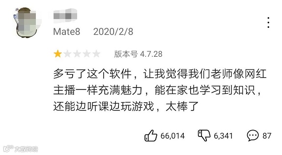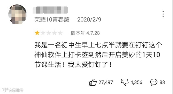 疫情之下的“在家上学”,本是一件好事。不过,这似乎并不能得到中小学生的“理解”。最先沦陷的即是钉钉在各大应用下载平台上的打分,大量报复性一星好评集中出现。“花式表扬”+“五星分期支付”,将钉钉的得分迅速拉至2分以下,一度低至1.3星。而据网上传闻,在应用商店中评分低于1星会被强制下架,这也可能是大量1星差评的来由:下架了是不是就不用上网课了?