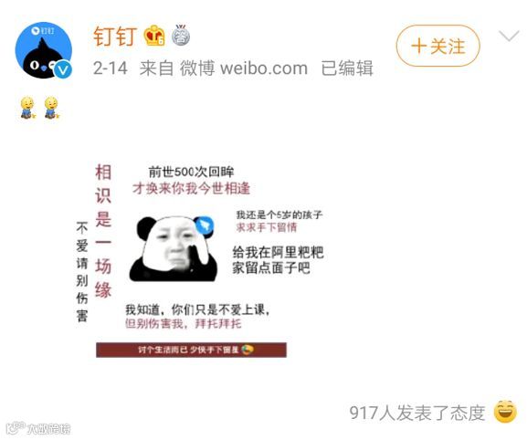于是乎,在2月14日情人节当天,钉钉在官微上先祭出一张魔性的图片,呼唤“不爱请别伤害”、“我知道,你们只是不爱上课,但别伤害我,拜托拜托”等。