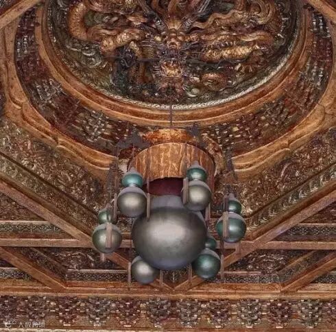 44、轩辕镜,古镜名,古人谓用之辟邪,其形如球,主要悬挂在卧榻前。图为故宫太和殿龙椅正上方有“盘龙藻井”,藻井上雕刻着一条龙,龙嘴下面叼着一个晶亮的圆球,即为“轩辕镜”,传说它是中国古代祖先“轩辕氏”制造的,可以分辨真假天子。现在城市广场中有些地方,也有各种圆球,类似“轩辕镜”的功能。