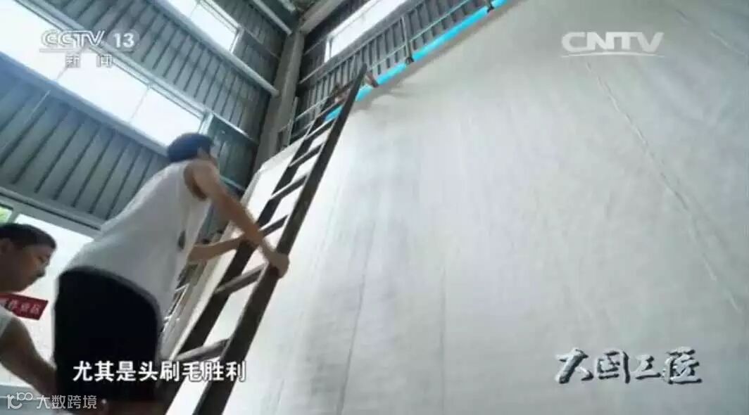 一切准备就绪,毛胜利站上了3米高的平台,他要把一张30多平方米的又薄又软的湿纸一刷一刷的定在加热的焙面上。