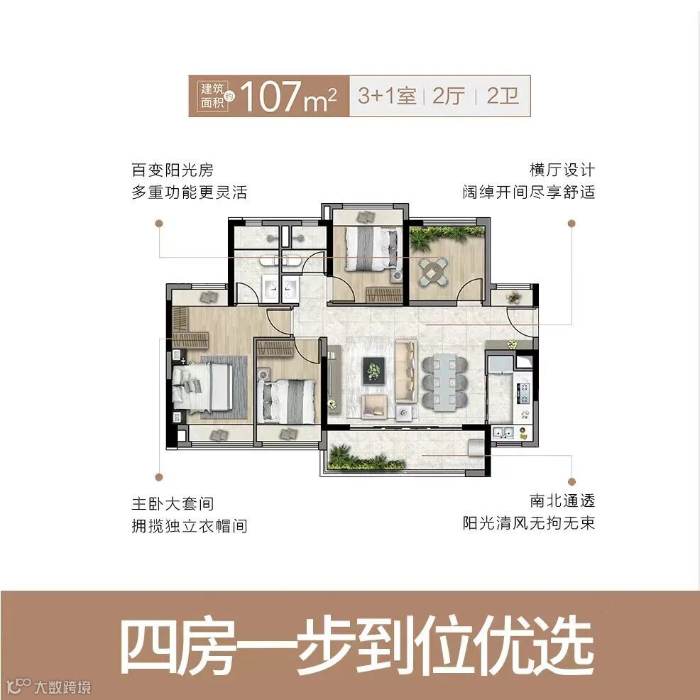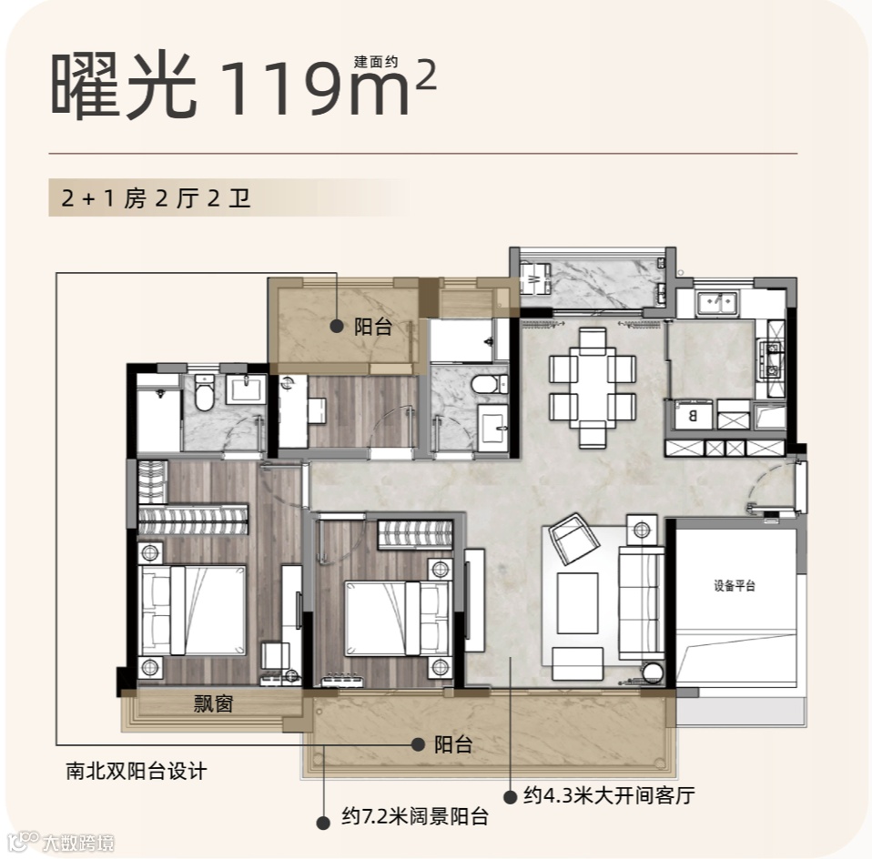 现在,该盘主推约105、119、139平四至五房高拓户型,享超高使用率,全部配置约6.4-7.7米瞰景大阳台,享南向四开间全明场域。