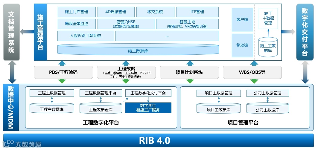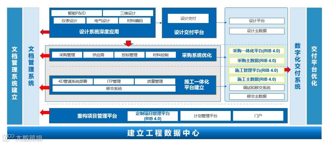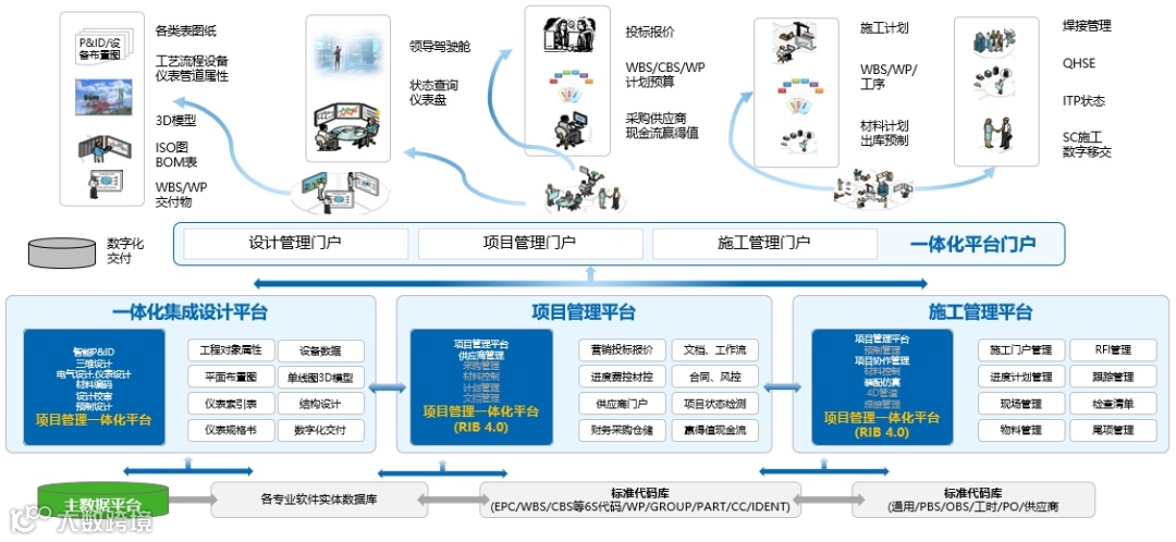 基于RIB 4.0搭建整体的项目管控平台,包括一体化集成设计平台、项目管理平台和施工管理平台,它的底层是主数据平台,包括各种标准代码,以及支撑EPC项目从设计采购到施工交付的一些基本数据。