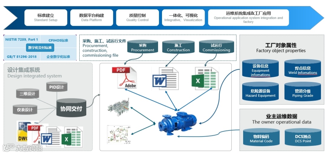 工程数字化的建设标准,经常用到的有ISO标准和国家标准,数字化交付标准主要包括NISTIR 7259 Capital Facilities Information Handover Guide, Part 1 , GB/T51296-2018石油化工工程数字化交付标准,GD/T51301-2018 建筑信息模型设计交付标准和GDT32575-2016 发电工程数据移交标准等等,基于这些移交标准,完成不同数字管控过程当中的数字化交付,其中ISO15926是所有标准当中的主体,它串联了从业主到总包商到数字化工程的设计。