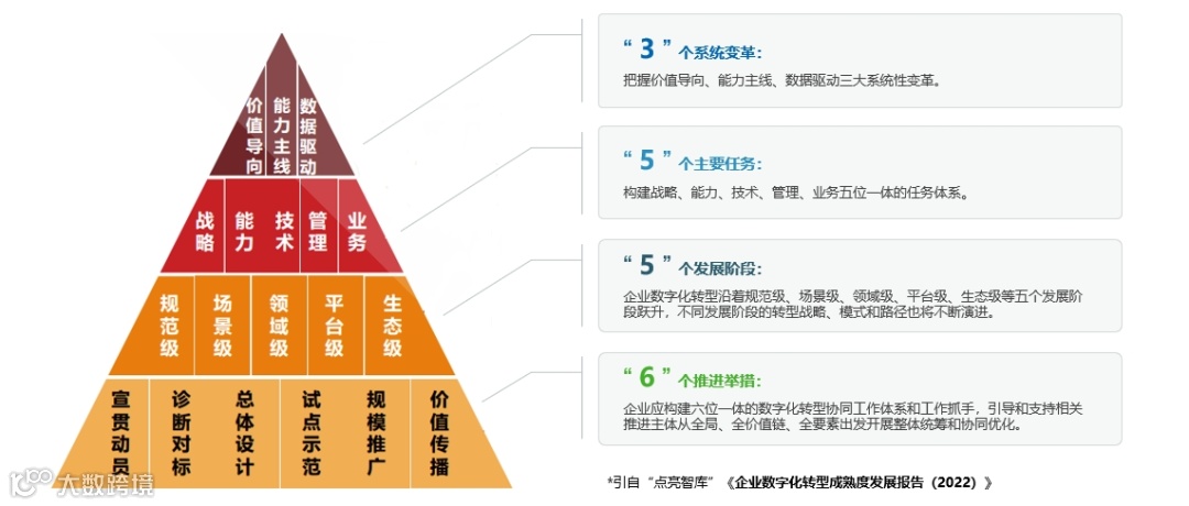 5 个发展阶段:企业数字化转型沿着规范级、场景级、领域级、平台级、生态级等五个发展阶段跃升,不同发展阶段的转型战略、模式和路径也将不断演进。