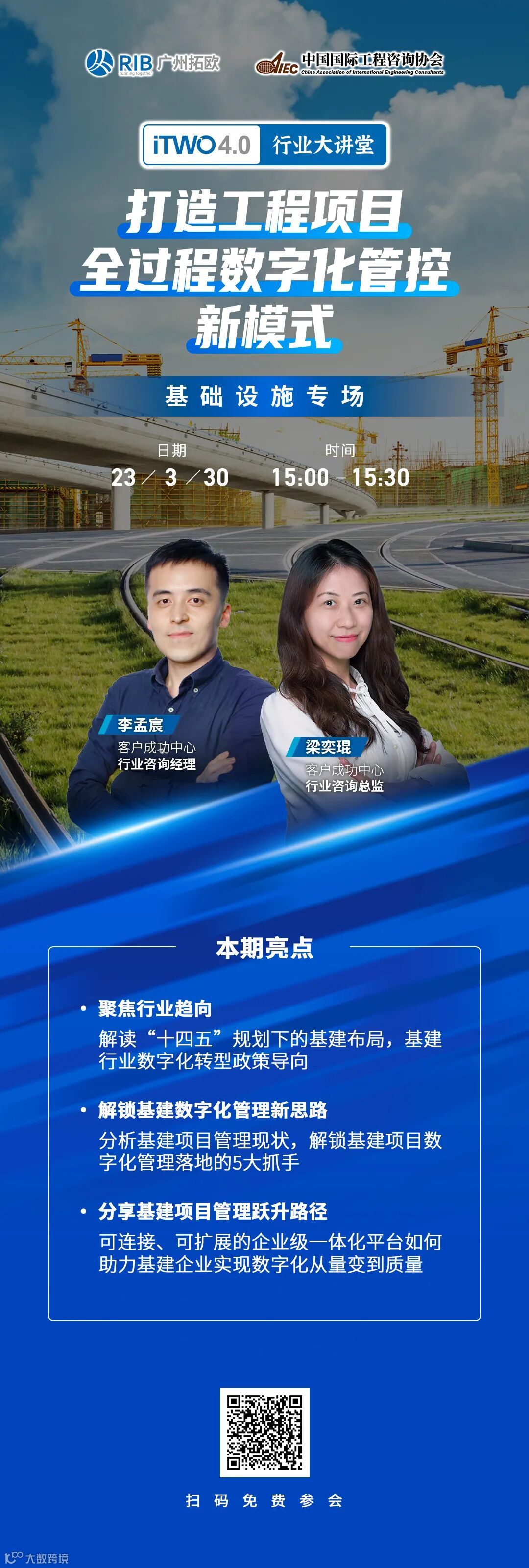 RIB客户成功中心行业资深咨询专家梁奕琨、李孟宸,将聚焦基础设施行业数字化建设新思路,解锁基建项目一体化管控新模式。