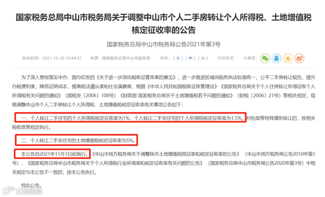 据中山税务局发布,11月1日起,将施行调整个人二手房转让个人所得税、土地增值税核定征收率的公告。(来源:中山税务局)