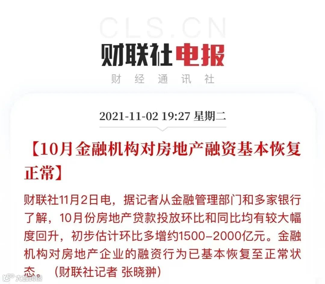 而11月2日,财联社报道称,10月份房地产贷款投放环比和同比均有较大幅度回升,则意味着,房企融资也基本恢复正常。