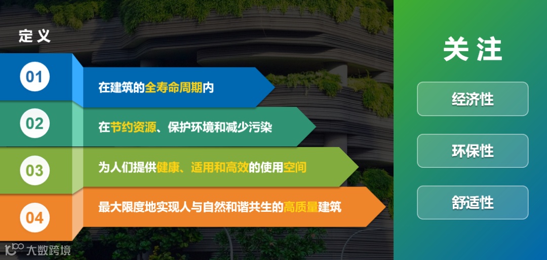 绿色建筑是指在全寿命期内,节约资源、保护环境、减少污染,为人们提供健康、适用、高效的使用空间,最大限度地实现人与自然和谐共生的高质量建筑。绿色建筑的关注点在于经济性、环保性(碳排)和用户舒适度。