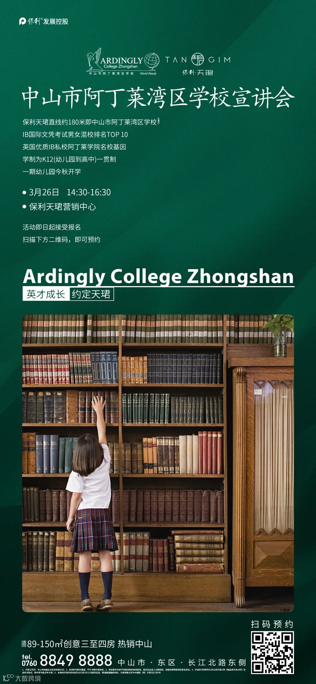 本周六(3月26日)14:30,在保利天珺营销中心,将举办中山市阿丁莱湾区学校宣讲会,扫描下图二维码,即可预约参加。