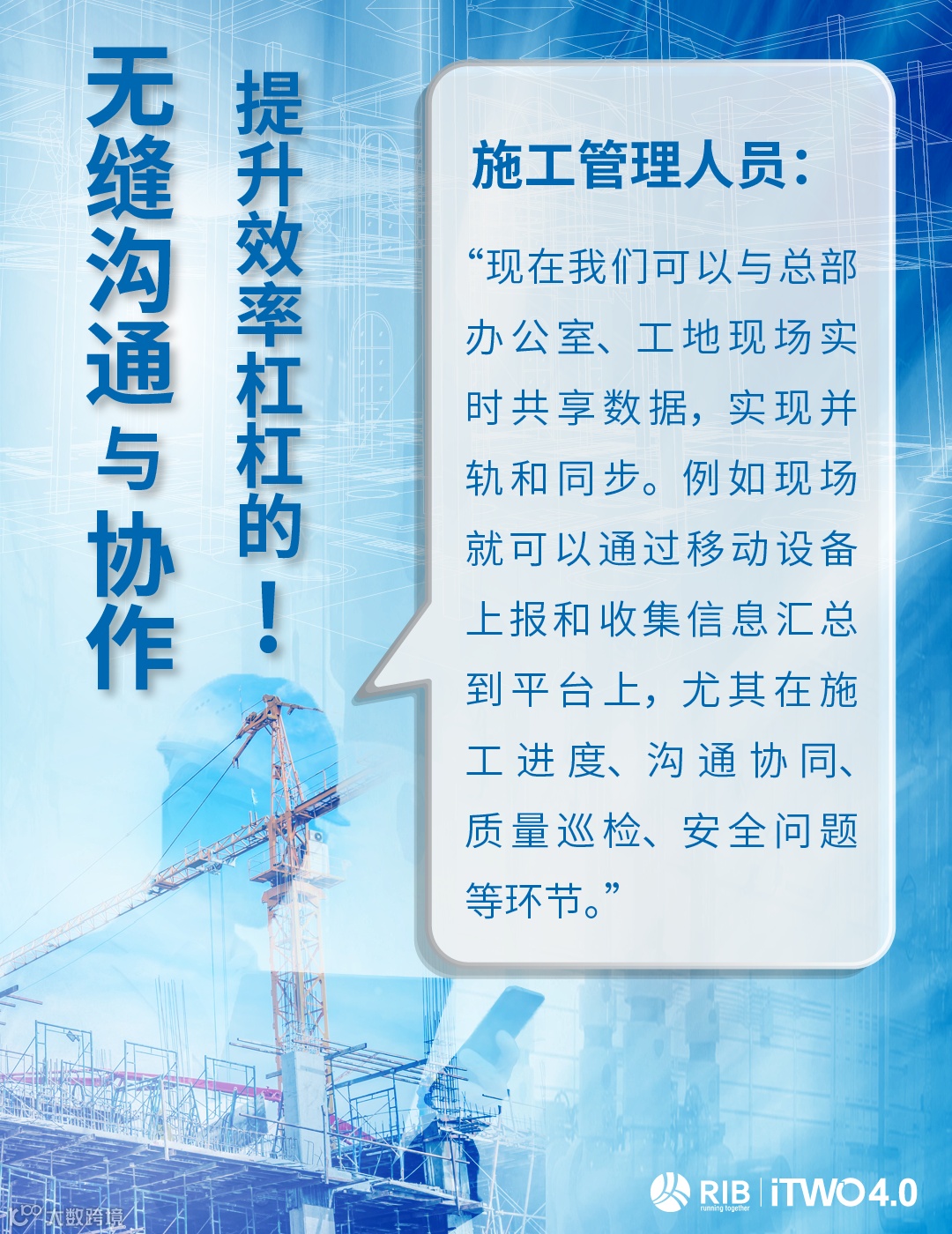 建筑施工面对工程量大、工期紧、质量安全要求高、施工队数量多、基层员工数字化意识较低等难题,现场管理亟需通过一个协同平台,来实现多方单位、跨部门人员作业的沟通与合作。现代的数字化施工协同模式将逐渐革新过往的信息处理方式,高效管理施工现场,简化现场人力工作。
