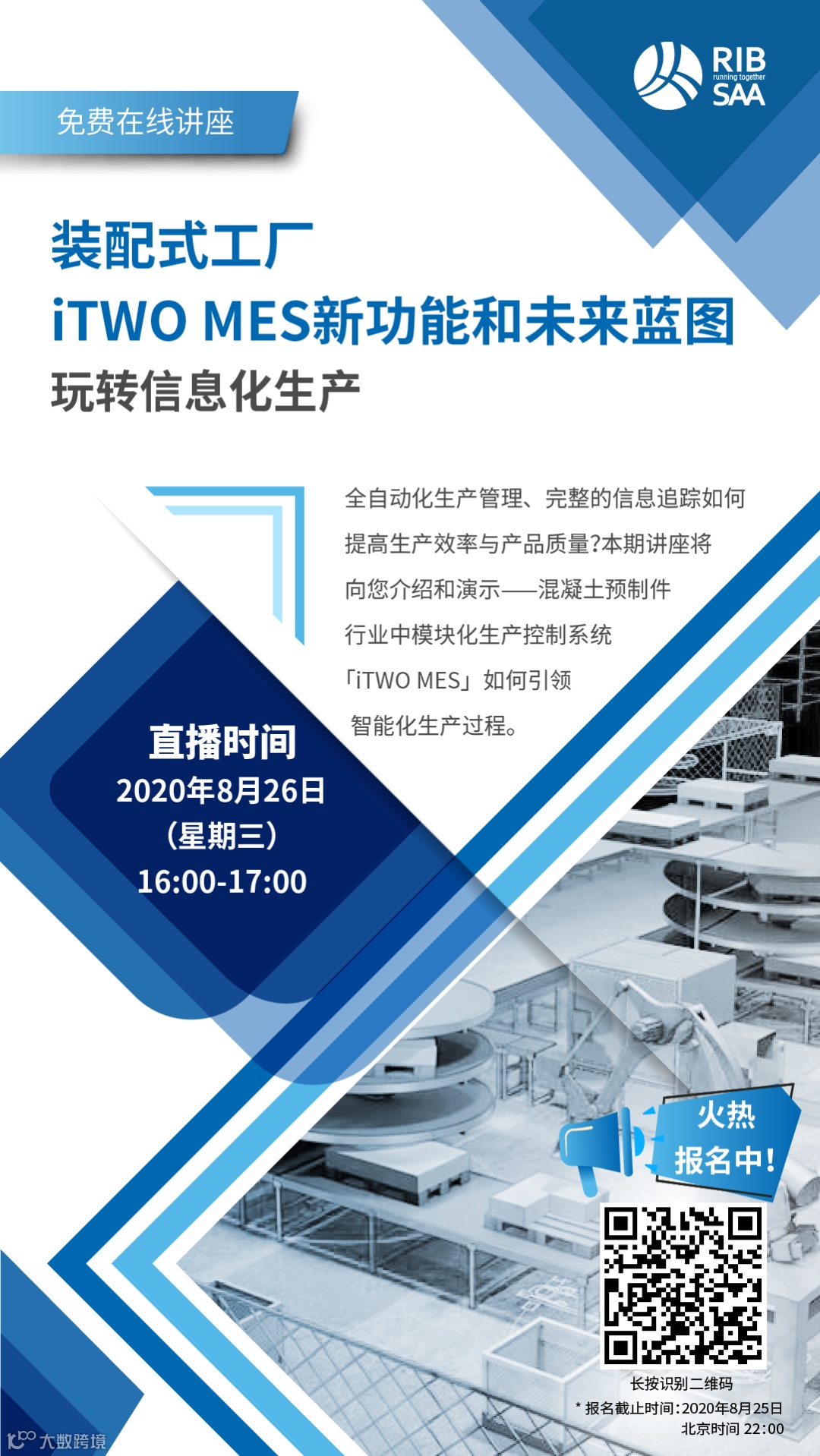 8月26日(星期三)16:00-17:00,我们诚挚邀请您参加RIB SAA公司新一期在线讲座。本次讲座中,RIB SAA的智能生产专家将通过实时演示,向您介绍混凝土预制件行业的模块化生产控制系统——iTWO MES如何引领智能化的预制件生产。更有众多惊喜隐藏功能待您发掘!