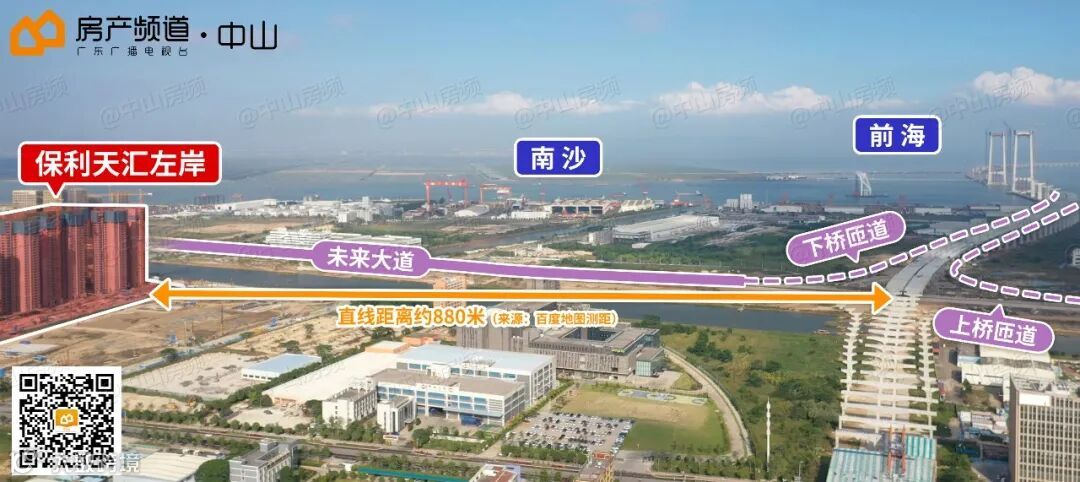 而保利天汇左岸离深中通道第一出口(横门互通)直线距离仅约880米!