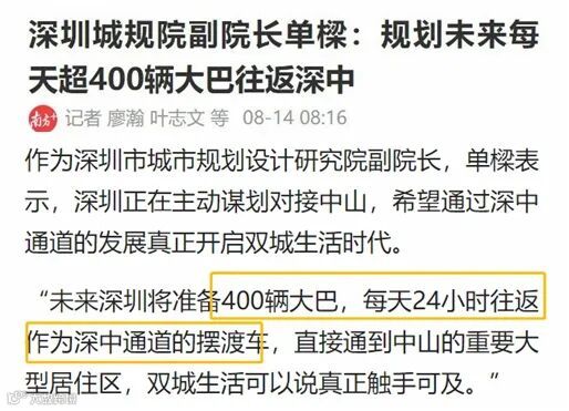 按照此前深圳城规院副院长建议,未来设置400辆大巴通过深中通道24小时来回穿梭,直通中山大型居住区!