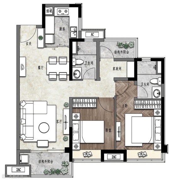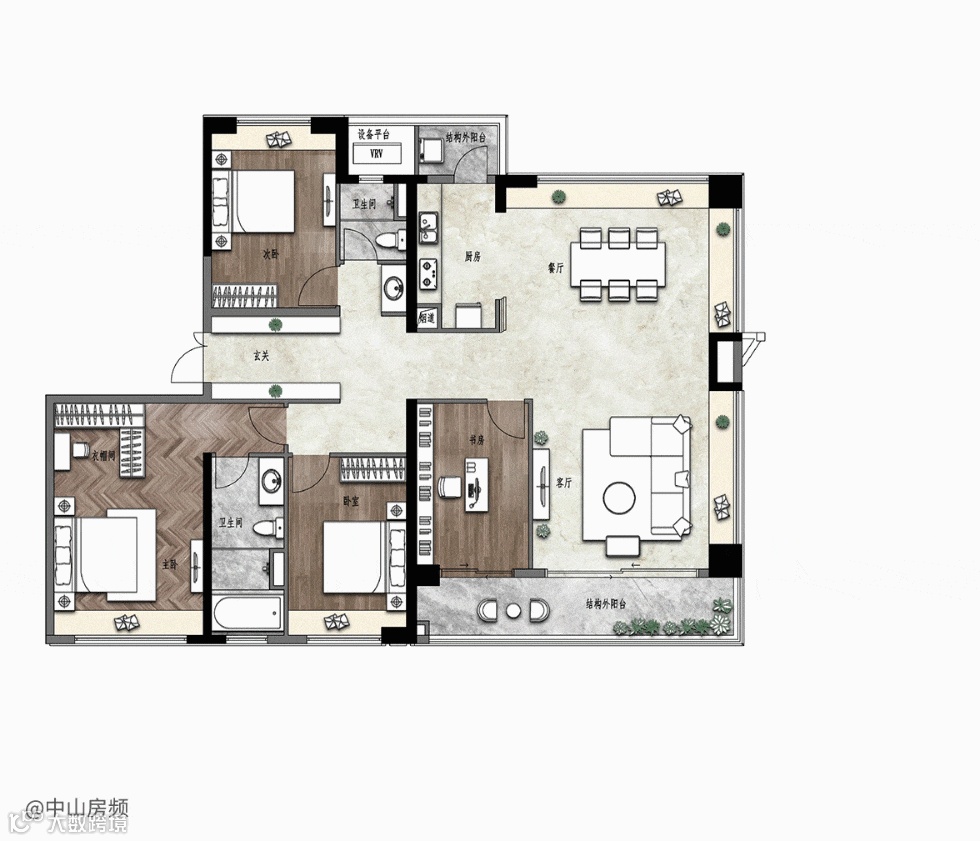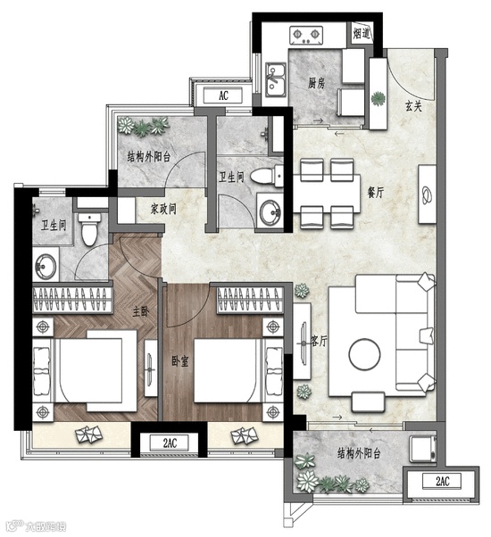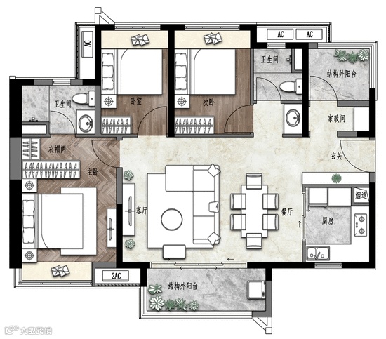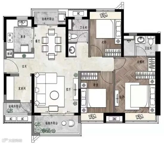 就拿建面约107㎡户型来说,入门右侧的家政间和结构外阳台,作为“魔法空间”存在,整个户型最高可以拥有4个房间!