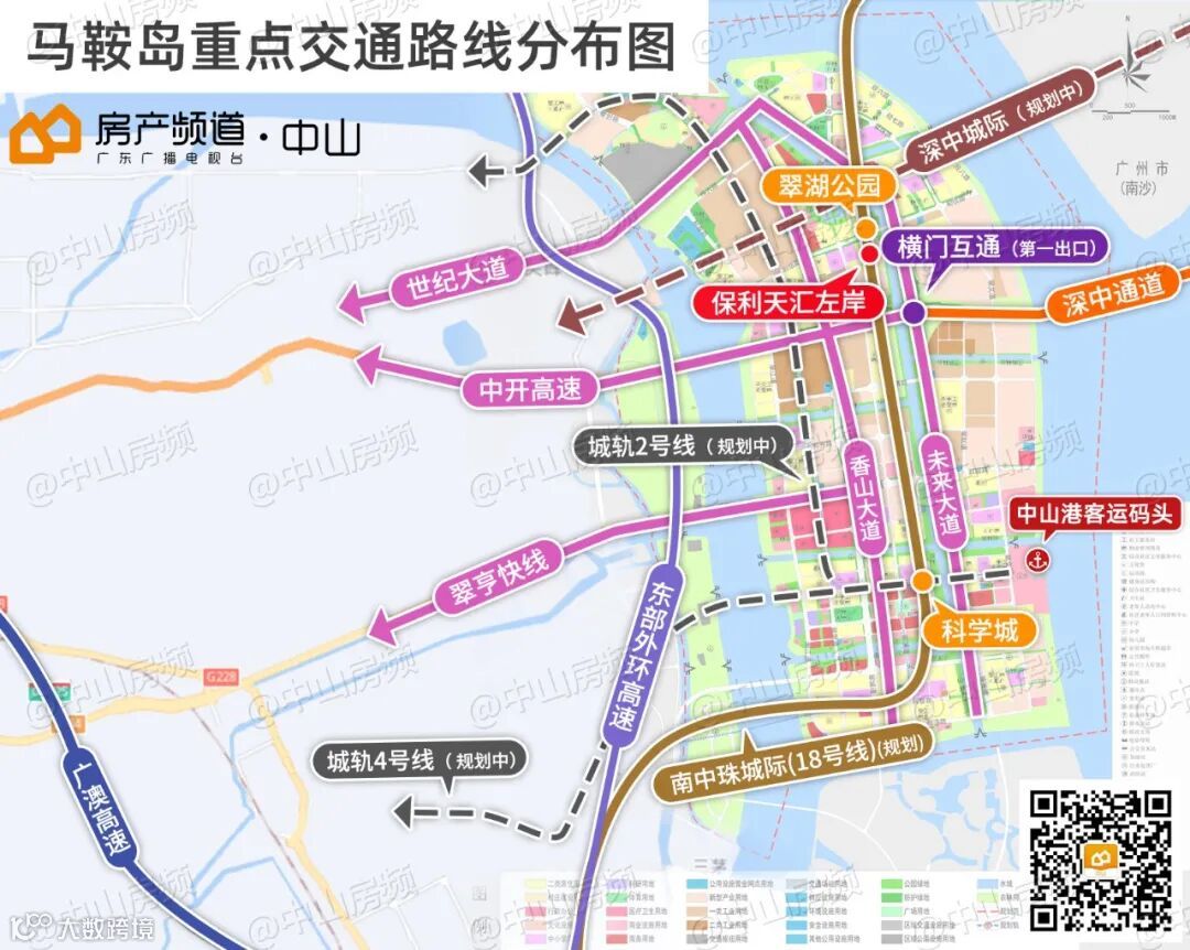 纵向上,南中珠城际(广州地铁18号延长线)动工节点越来越近,马鞍岛将进一步坐实湾区十字枢纽的地位!