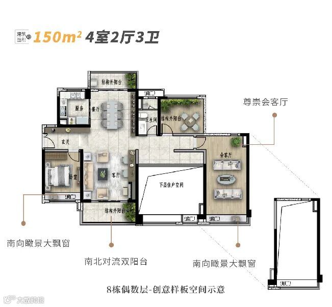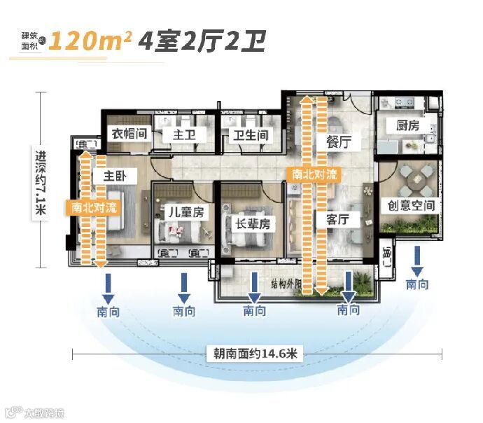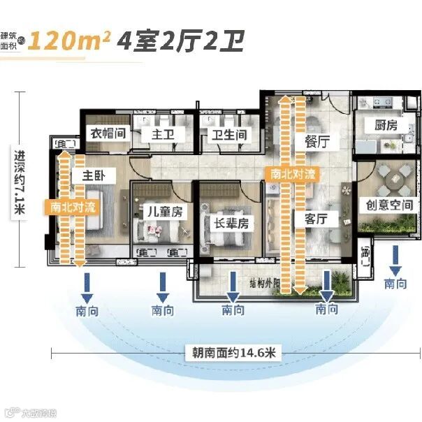 5.8米开间超大横厅,配备南向超长景观阳台,确保全屋通透。方正的户型加上百变空间,生活的舒适度不用多说。