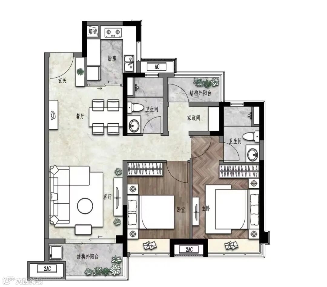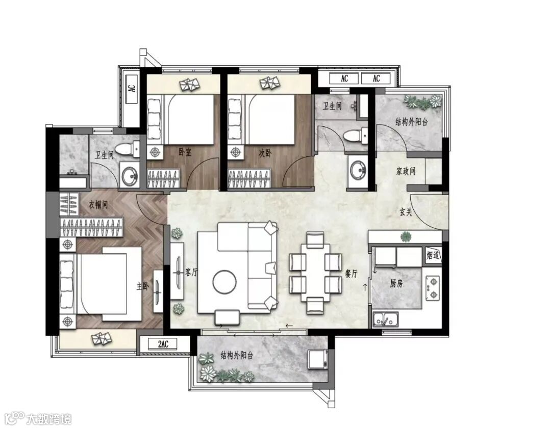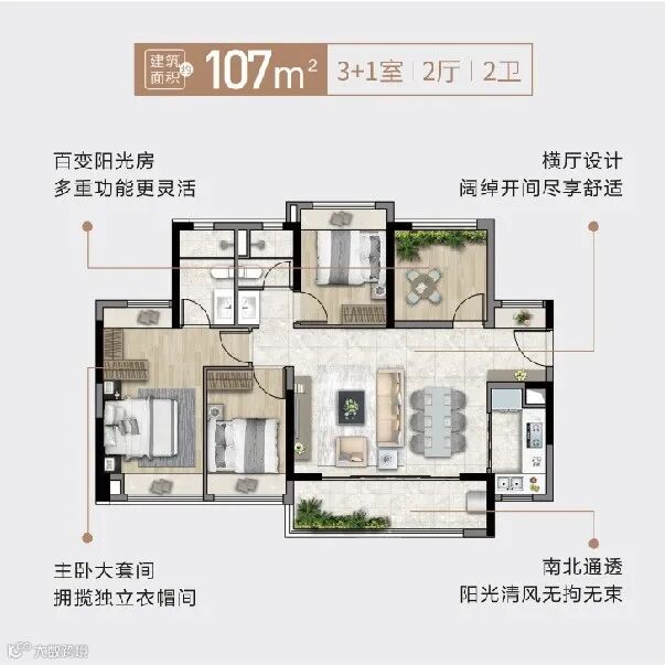 而约107平做出了四房,更做到五开间朝南,非常适合刚改、一步到位的朋友。