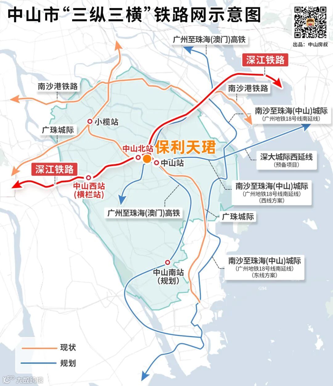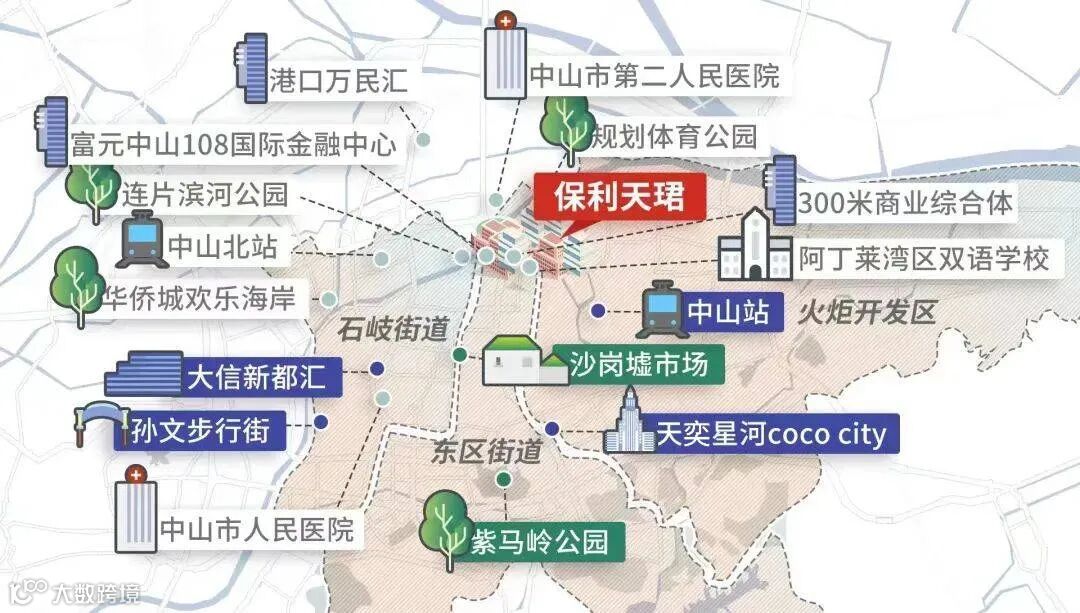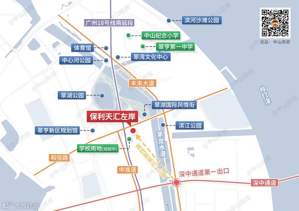 不仅如此,中山北站、中山站两大TOD都在保利天珺直线3.5公里范围内,未来深江铁路(规划中)途经,大家搭高铁过对岸,跟公交一样方便。