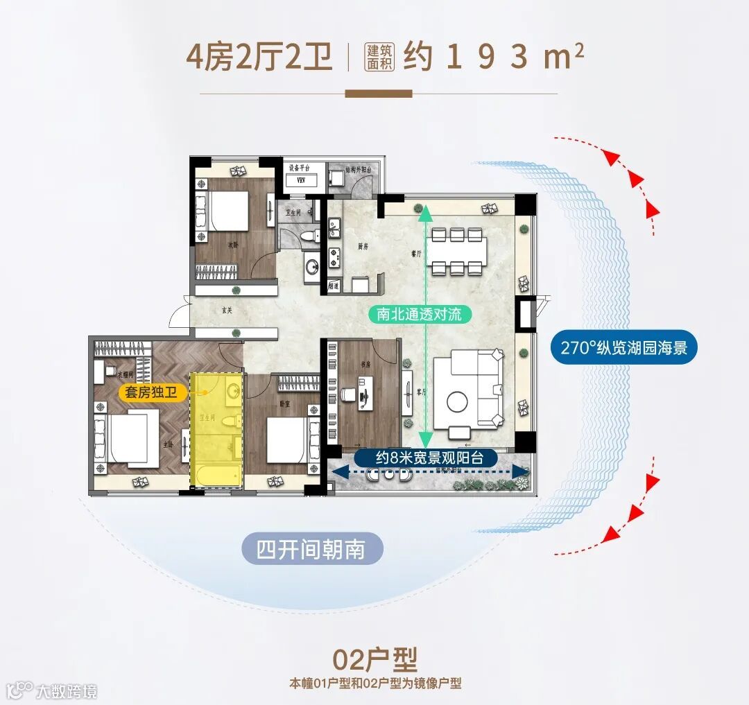 户型不仅做到四开间朝南、南北通透对流,餐客厅还霸气实现270°巨幕瞰景,以及约8米的IMAX宽景观阳台,将海风、海景、茅龙水道、翠湖公园园景,通通收藏。