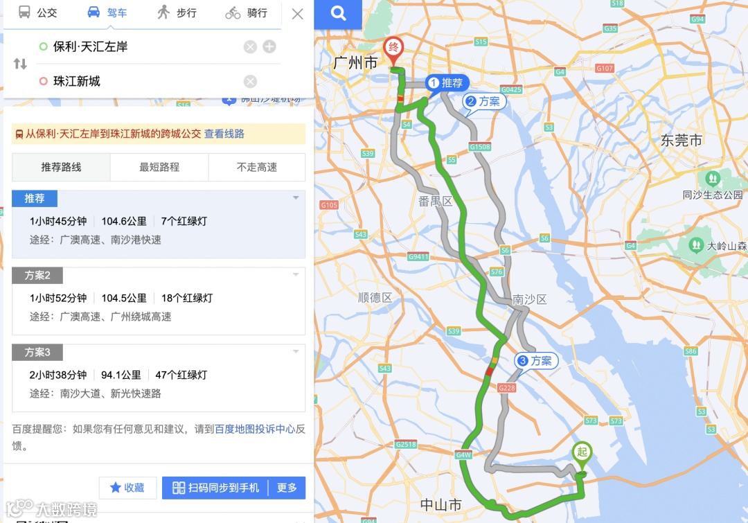 那么去广州呢,谁更方便?从目前自驾方案来看,肯定是岐江新城。