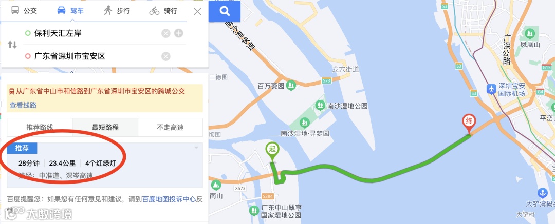 住在马鞍岛到深圳到底有多方便?看下图数字,百度地图已经生成驾车路径,全程仅约20多公里,一路高速跨海,深中通勤0距离。