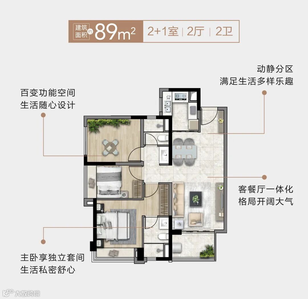 其中,建面约89㎡2+1户型,是东区总部在售最小三房户型,也是目前市面上稀缺的小户型产品。