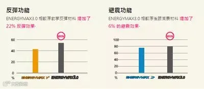 ENERGY MAX3.0有极佳的瞬间回弹能力与吸收高冲击力的特性,让穿着者的每一次踩踏都能感受到舒适、有弹性的脚感。