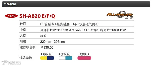 SH-A820不管从功能性或外观样式来评估,都是双相当超值的好鞋。刚刚获得香港公开赛女单冠军的台湾选手戴资颖等球星都将SH-A820选为指定装备。