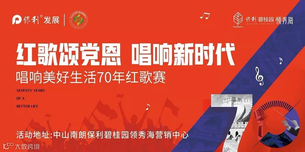 为庆祝新中国成立70周年,重温红色经典,以“红歌颂党恩,唱响新时代”为主题的唱响美好生活70年红歌赛决赛,将于10月26日在保利碧桂园领秀海销售中心前广场举行,如遇台风天或暴雨天等恶劣天气另议,具体安排另行通知。