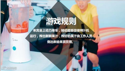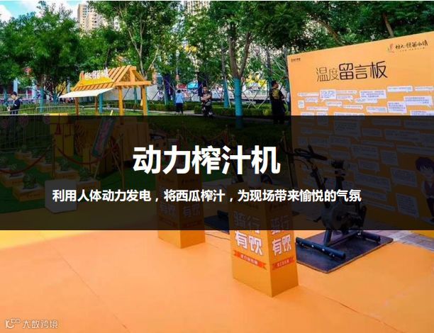 动力榨汁机,利用人体动力发电,将西瓜榨汁,来宾坐上动力单车,转动踏板促使榨汁机运行,榨出新鲜果汁,榨好的果汁由客户饮用。