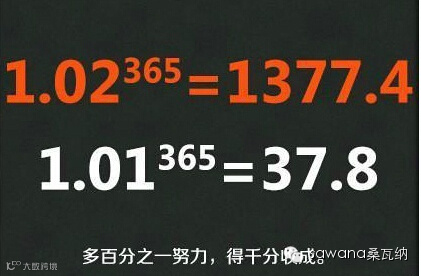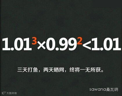 sawana 1.01的365次方=37.78343433289>1也就是每天进步一点,一年以后,你将进步很大,远远大于“1”。0.99的365次方=0.02551796445229<1也就是说你每天退步一点点,你将在一年以后,远远小于“1”,被人抛在后面。
