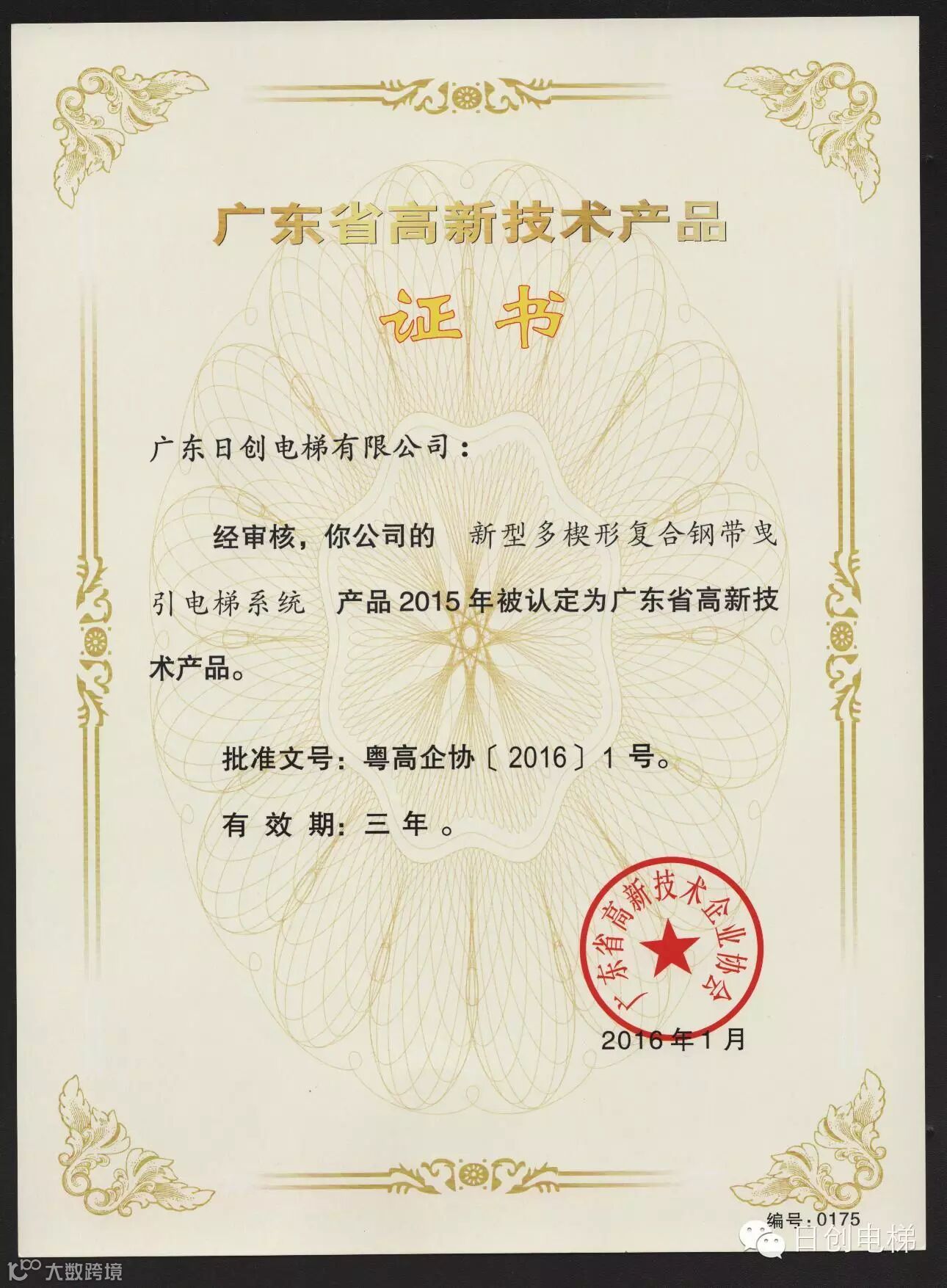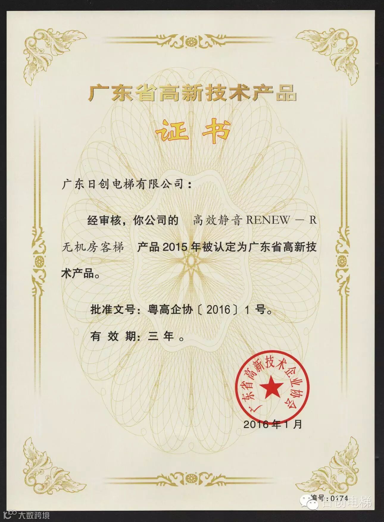 2016年1月,广东日创电梯有限公司传来喜讯,其研发的高效静音RENEW-R无机房客梯和新型多楔形复合钢带曳引电梯系统获得广东省科学技术厅颁发的“广东省高新技术产品”证书。