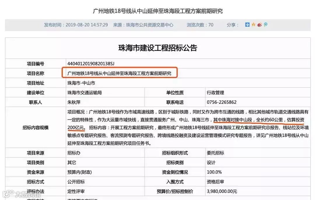 8月20日,珠海市挂出招标公告显示,广州地铁18号线珠海段对接中山段,全长约60公里,估算投资200亿元。届时,18号线作为大运量市域快线,直接贯通服务广州、中山、珠海三市。