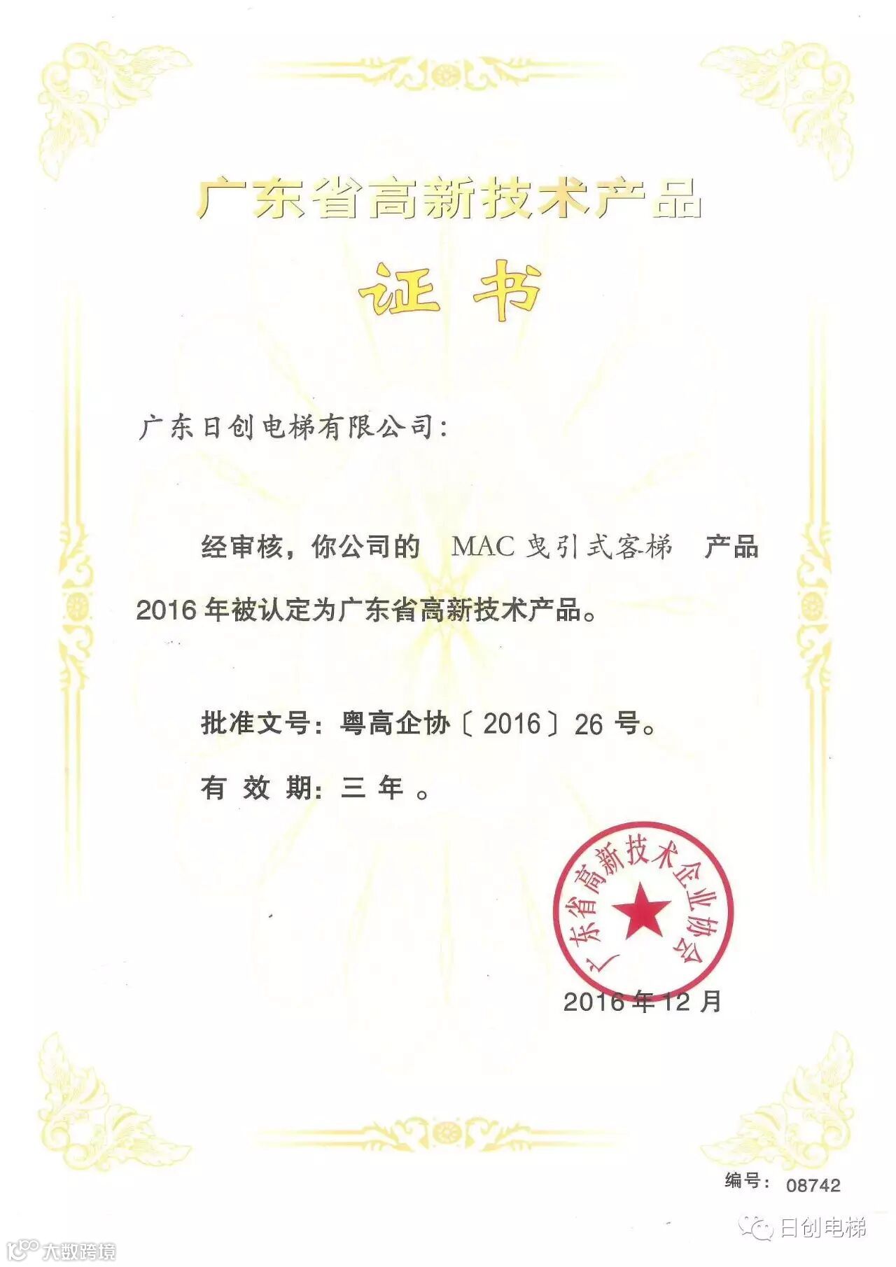 2017年2月14日,日创电梯有限公司传来喜讯,其研发的“MAC曳引式客梯”喜获广东省高新技术企业协会颁发的“广东省高新技术产品”证书。“广东省高新技术产品”是《根据广东省2016年高新技术产品认定的通知》(粤高企协〔2016〕12号)的要求,经企业申报、专家评审等规定程序,认定评审完成的。该项荣誉是广东实施产品技术战略的重要内容之一,是提高产品质量总体水平、企业开拓市场能力和产业整体素质的重大砝码,增强经济发展后劲的强大动力。高新技术产品在技术、工艺、质量、安全性能等方面达到国际先进水平,并且具有良好的经济效益和广阔的市场前景。