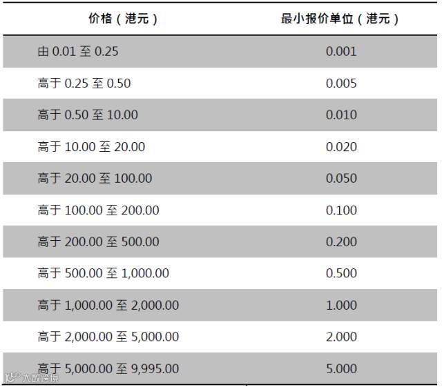 四是最小报价单位不同。深市A股是0.01元人民币;而港股不同价格的股票,最小报价单位不同,股价越高,最小报价单位越大。港股最小报价单位具体情况如下: