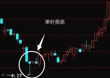 单针探底这种形态属于比较经典的形态,多数是主力吸筹的动作,下影线的长度要求是长于实体部分。见下图: