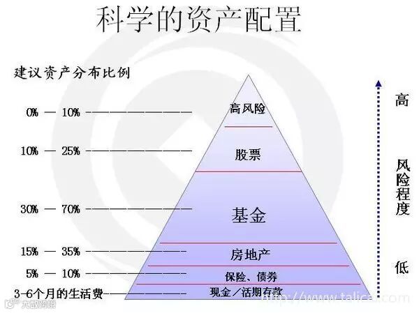 金字塔定律:10%高风险产品;股票和基金占大部分,房产,保险,现金做基础。