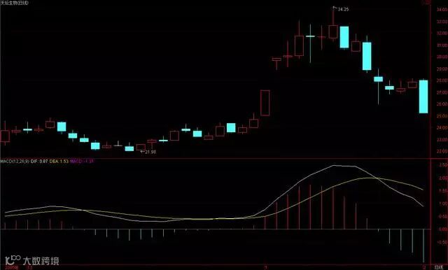 个股位于相对的历史低位,有比较大的上涨空间,在实际操作中如果发现DIFF指标和DEA指标开口向上,表明股价在这之后相当长的一段时间内,会出现较大幅度的股价上涨趋势。