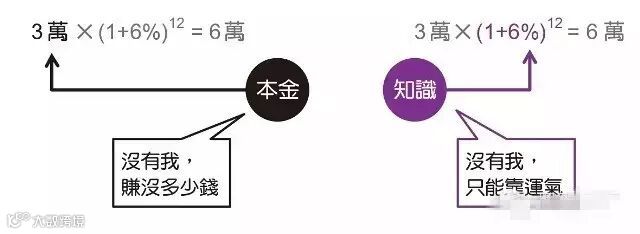 有没有发现一件事?不管是文字描述或是数学计算,两者似乎都告诉我们:要先有钱,然後才能赚钱投资。因为若是将算式中前面的3万元本金换成0元,整个计算结果就变成零,我们就在潜移默化中渐渐被误导,以为要先有一笔本金才能开始投资。然而,别忘了如果没有後面报酬率的算式,就算本金再大计算出来的结果仍然是零呀!而那些正是代表存钱同时也要准备的投资知识,并不需要等有钱才开始。