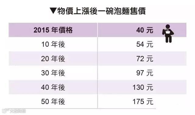 再来,过去30年来消费者物价指数年增率大多介于1~4%,为了提升危机感,就以较重的3%来计算;如此平均一碗泡面的价格每隔几年就会变动如下:
