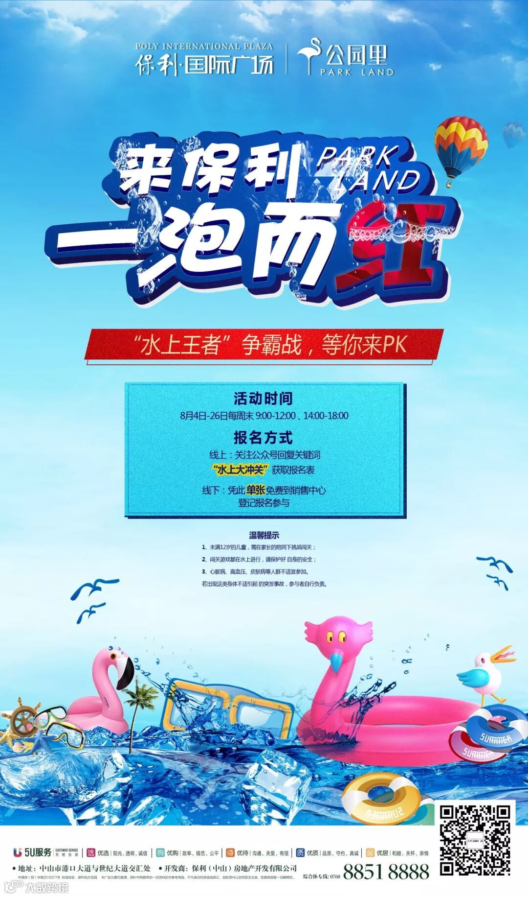 线上:关注“保利地产中山公司”微信公众号,回复关键词“水上大冲关”获取报名表