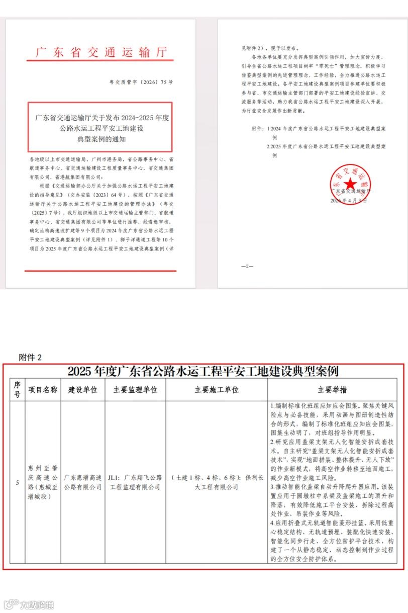 继斩获2025年度广东省在建高速公路工程质量安全综合检查全省第二名、成功入选广东省公路水运工程质量安全大会示范观摩点以来,第三次摘得省级荣誉表彰。
