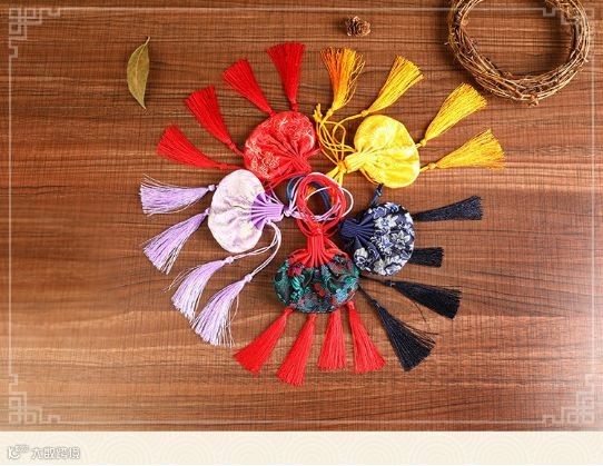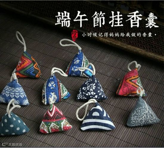 中国自古便有习俗,端午节小孩佩香囊,不但有避邪驱瘟之意,而且有襟头点缀之风。香囊内有朱砂、雄黄、香药,外包以丝布,清香四溢,再以五色丝线弦扣成索,作各种不同形状,结成一串,形形色色,玲珑夺目。
