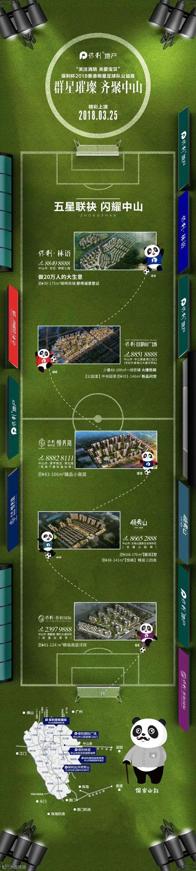 五宝相聚,嗨翻中山。2018年3月17-18日,萌力十足的保利中山五盘代言人——熊猫宝宝,变成熊猫侠,惊现中山城区各大商圈“打劫”,赠送足球门票终结不开心,并且联合足球宝贝在人流密集广场进行快闪,把本次“关注消防·关爱宝贝”保利杯香港明星足球队公益赛的宣传拉到高潮。