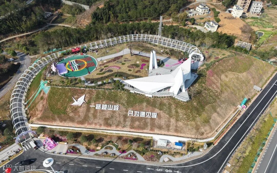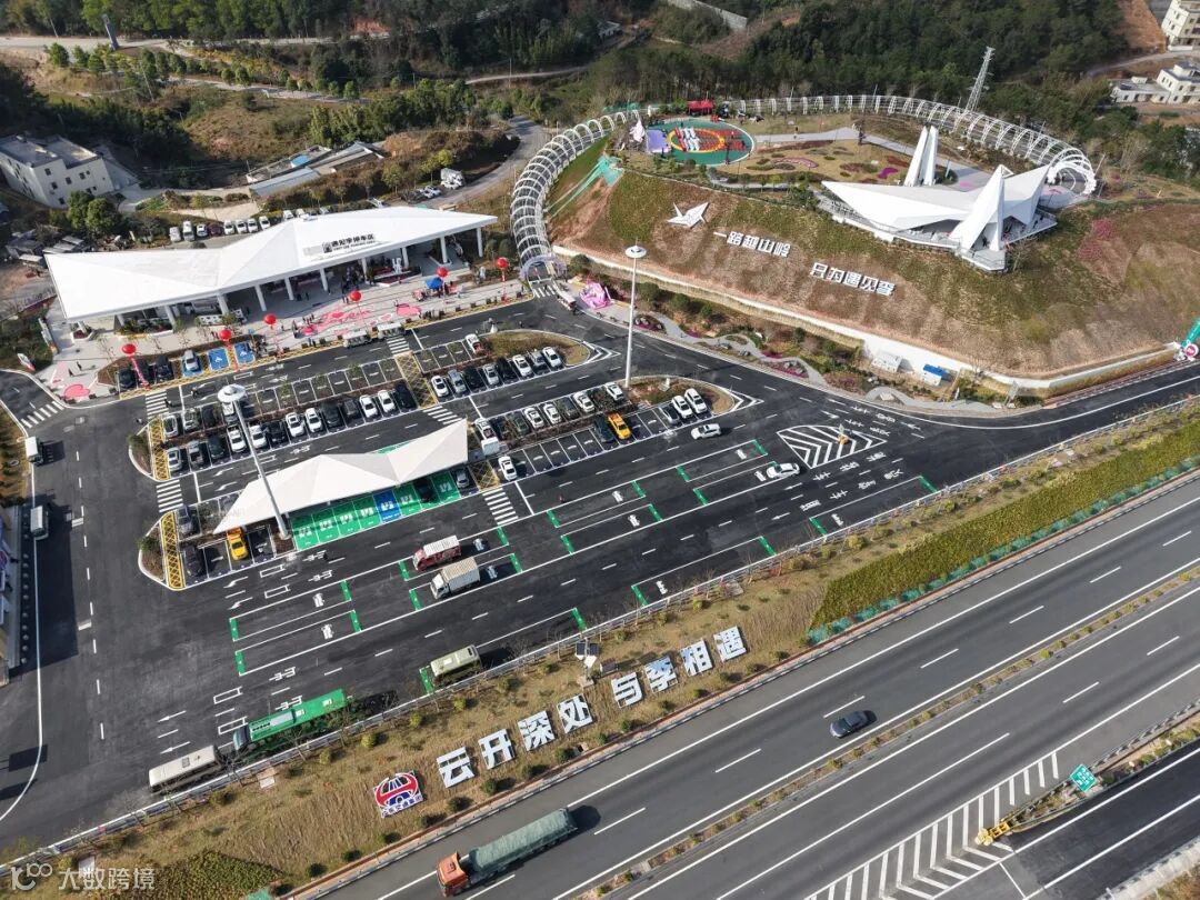 项目创新性以爱情为主题,打造了核心特色施工地标——13.14米高的爱情鸟构筑物,该地标为多折面板壳结构,分为鸟身及鸟尾两部分,其独特造型与浪漫主题完美呼应,成为停车区标志性景观。业态创新上,打造520美食街、花影长廊等特色景观,通过520索桥、涵洞实现与三华李度假区、周边采摘园及G359国道的无缝衔接。