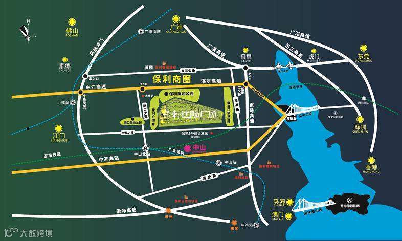 保利国际广场坐落港口大道和世纪大道两大交通主干道交汇处,位于中江高速港口出口;未来可接驳深中通道, 30分钟则可直达深圳宝安;周边高速路网遍布,东望京珠高速和广珠中线、南临中山轻轨北站、西接港口大道、北靠中江高速;1小时内则可直通广珠,10分钟直达石歧主城区,20分钟可达东区、开发区;堪称珠三角黄金走廊!